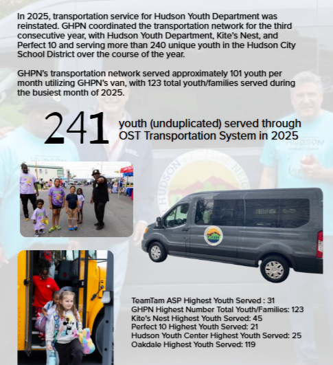 In an effort to improve chronic absenteeism in the Hudson City School District, GHPN has agreed to assist the District with transportation for students on an emergency basis. GHPN agreed to partner with Coxsackie Transport in September of 2023, to assist in transporting students home from our CO-HOST out-of-school-time programs, which we have continued to coordinate for multiple partners/organizations, since the 2023-2024 academic year. Summer transportation is also coordinated and available for campers to attend Oakdale Summer Camp and other community-based, programming for youth during the extended break from school to keep kids active, engaged, laughing, and learning together in July and August.
